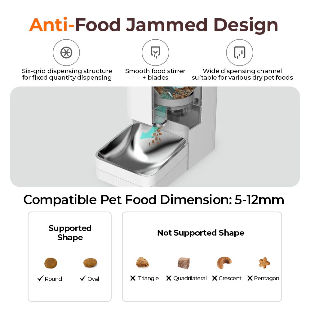 Një ushqim në trajtë kokrrash që ka një diametër tepër të madh ose të vogël mund të shkaktojë bllokim. Jo i përshtatshëm për ushqime të thara në ngrirje ose për ushqim në trajtë kokrrash që kan formë të veçantë.