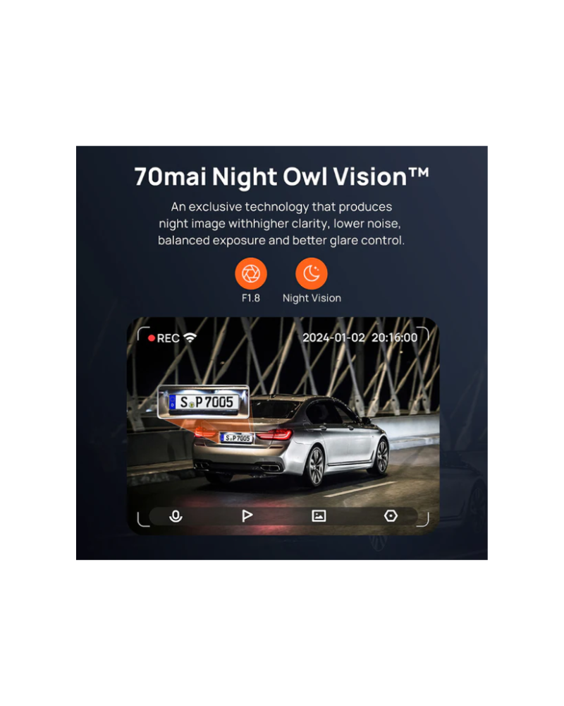 - 70mai Night Owl Vision: 2.5 times of 1080P & 3D DNR + WDR image-processing algorithms work together to achieve a superior all-day vision.