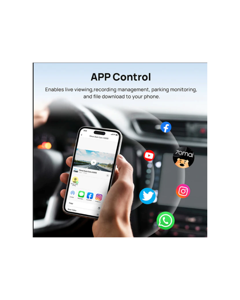 - App Control: With built-in WiFi, the A500S connects to the 70mai App, so you can check recordings and take photos in real time.
