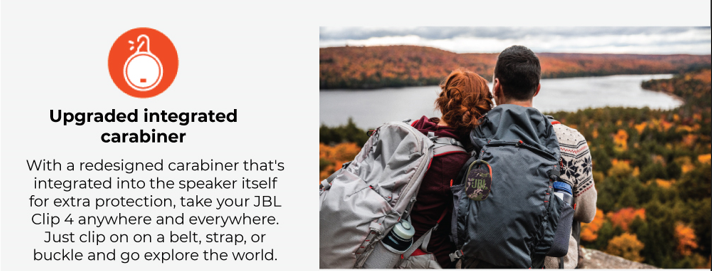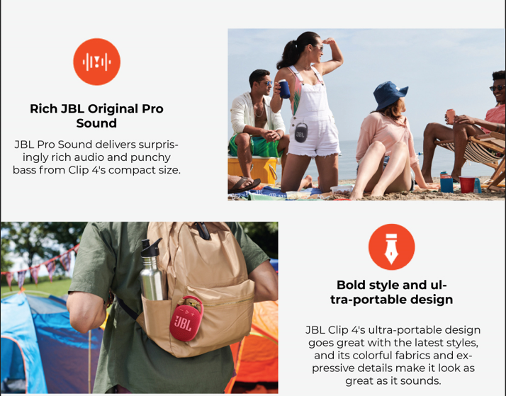Ky boks jep tinguj “JBL Original Pro” deri ne 10 ore. I mbeshtjelle plotesisht me materiale shumengjyrëshe me detaje ekspresive te frymezuara nga moda aktuale, mund ta pershtatni lehtesisht me stilin tuaj. Edhe pse i vogel ofron tinguj mbreslenes JBL pavaresisht madhesise se tij te vogel. Me kapesen e tij, te qendrueshme, mund edhe te lidhet me rrobat ose çanten tuaj te shpines, duke e bere shoqeruesin tuaj te preferuar ne çdo kohe. Plotesisht i papershkueshem nga uji (niveli: IP67).