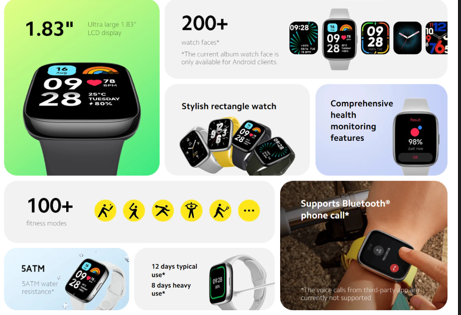 Redmi Watch 3 Active, ekrani i ri ultra i madh 1.83″ përmban ngjyra të pasura, ekran të qartë dhe vizion mahnitës, duke ju lejuar të shikoni gjithçka lehtësisht, nga njoftimi i mesazhit deri te të dhënat e stërvitjes. Xhami i lakuar 2.5D me rezistencë të lartë lejon më shumë pamje elegante dhe rezistencë më e mirë ndaj përdorimit. Forma klasike dhe e thjeshtë e orës drejtkëndëshe përmban një trup të përpunuar nga NCVM, me një përfundim metalik që përmirëson pamjen e saj të shkëlqyer. Lidheni orën tuaj me smartphone nëpërmjet Bluetooth. Pavarësisht nëse jeni duke punuar ose duke bërë stërvitje, mund të ngrini dorën për t’iu përgjigjur thirrjeve telefonike në një mënyrë më të përshtatshme.